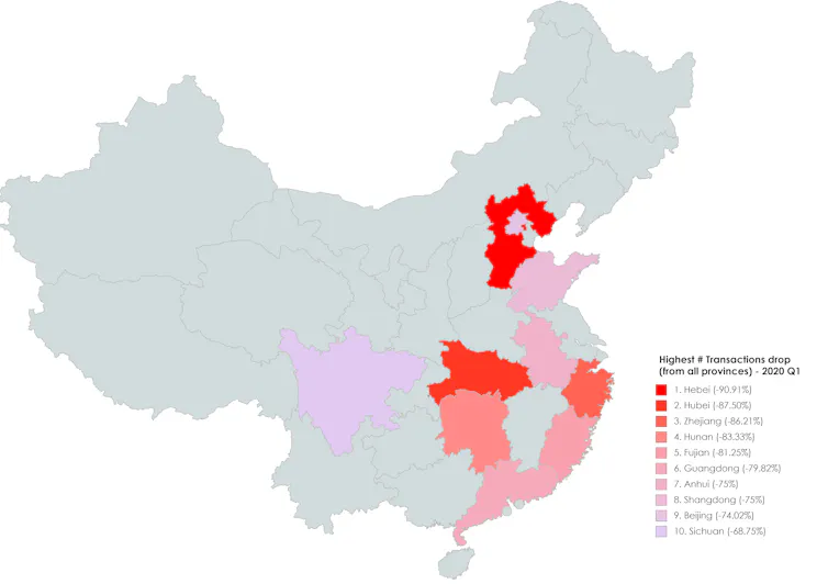 Most affected provinces, Q1 2020 in comparison with Q1 2019